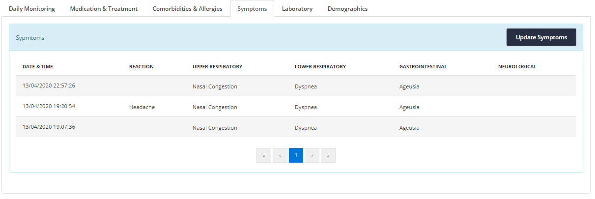 The Symptoms Section is organized in a Table with five entries, as shown in Figure 4.22. In the first column, the Date and Time is shown, while in the remaining four columns, the Constitutional, the Upper Respiratory, the Lower Respiratory, the Gastrointestinal and the Neurological symptoms are defined.